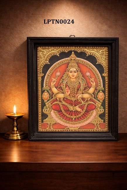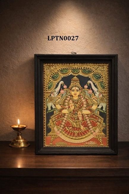 Product Description:This exquisite Tanjore painting depicts Goddess Lakshmi seated gracefully on a lotus. Lakshmi is adorned with traditional jewelry and holds lotus flowers in both hands, symbolizing purity and prosperity.