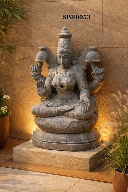 A beautifully carved stone statue of Lord Ganesha, a widely revered Hindu deity known as the remover of obstacles, the god of wisdom, prosperity, and good fortune. The statue is intricately detailed, depicting Ganesha with multiple arms, each holding symbolic objects.