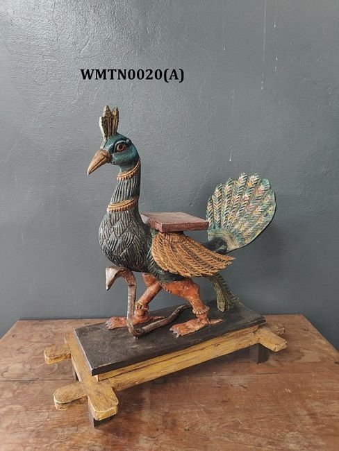 This vahana showcases a majestic peacock with a regal posture and intricately patterned wings. Its vibrant hues and detailed craftsmanship highlight traditional mythological symbolism.