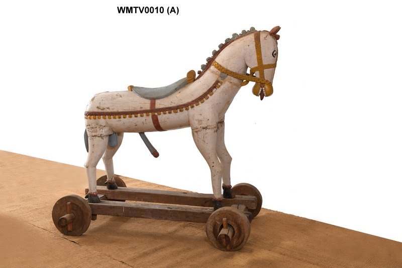 Product Description:This original painted wooden horse originates from Southern Karnataka. It sits on a top painted trolley that allows it to be pushed around easily. This Bhuta folkish tribal horse is an extremely rare antique piece. During the temple processions, ceremonial bronze images of the deity (Utsav murti) are carried beyond the temple compound on poles, on their animal vehicles or vahanas.