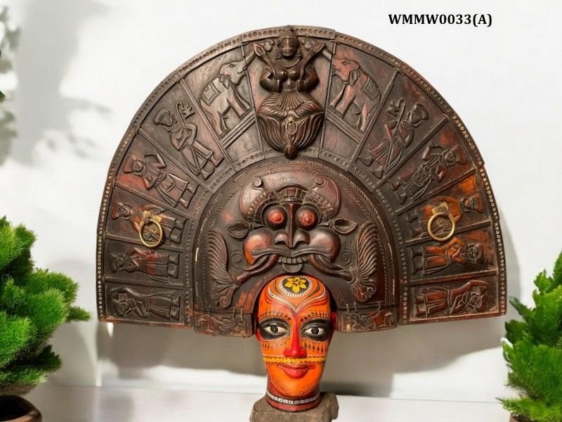 Product Description:Theyyam headdress is a unique find from North Kerala. Made of wood, it features intricately carved figures, including Goddess Lakshmi and her attendants. Performers wear oversized headgear, masks, breast plates, skirts, and arm ornaments, and spend hours preparing themselves for the ritual.