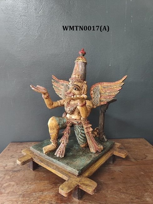 Product Description:This vahana depicts a beautifully carved winged guardian figure with a Hanuman face, in a kneeling posture, symbolizing devotion and service. The intricate detailing and vibrant traditional colors enhance its divine and ceremonial presence.
